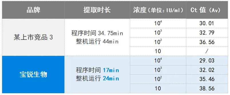 3、稀释乙肝病毒(HBV)阳性血浆样本至浓度分别为10⁴、10³、10²、10 IU/ml作为待测样本,分别采用某上市竞品3核酸提取试剂(磁珠法)和宝锐生物核酸提取试剂(磁珠法)提取200ul样本核酸,各提取2个平行样本,并使用宝锐高灵敏度M2071荧光定量PCR试剂进行检测。结果如下:
