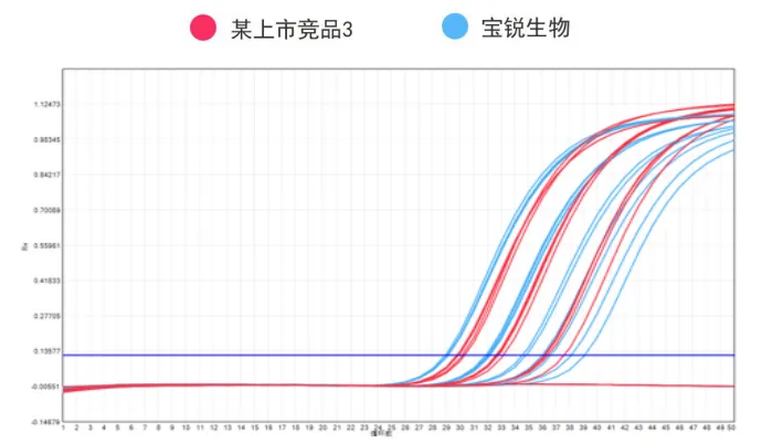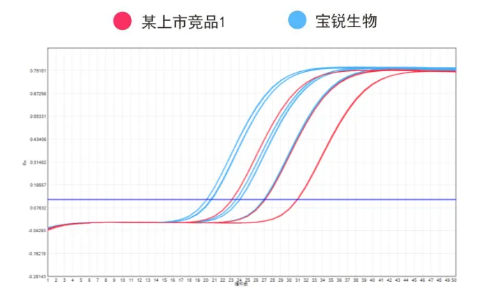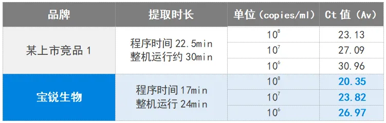 2、稀释假病毒样本(RBCS-RNA)至浓度梯度分别为10⁶ copies/ml和10⁷copies/ml和10⁸copies/ml作为待测样本,分别采用某上市竞品1核酸提取试剂(磁珠法)和宝锐生物核酸提取试剂(磁珠法)提取200ul样本核酸,各提取2个平行样本,并使用宝锐高灵敏度M5134荧光定量RT-PCR试剂进行检测。结果如下: