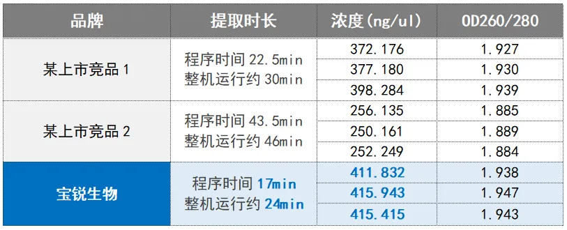 1、用猪血液样本作为待测样本,分别采用某上市竞品1核酸提取试剂(磁珠法)、某上市竞品2核酸提取试剂(磁珠法)和宝锐生物核酸提取试剂(磁珠法)提取200ul样本核酸,各提取3个平行样本,得到的相同量提取产物进行核酸浓度纯度测定。结果如下: