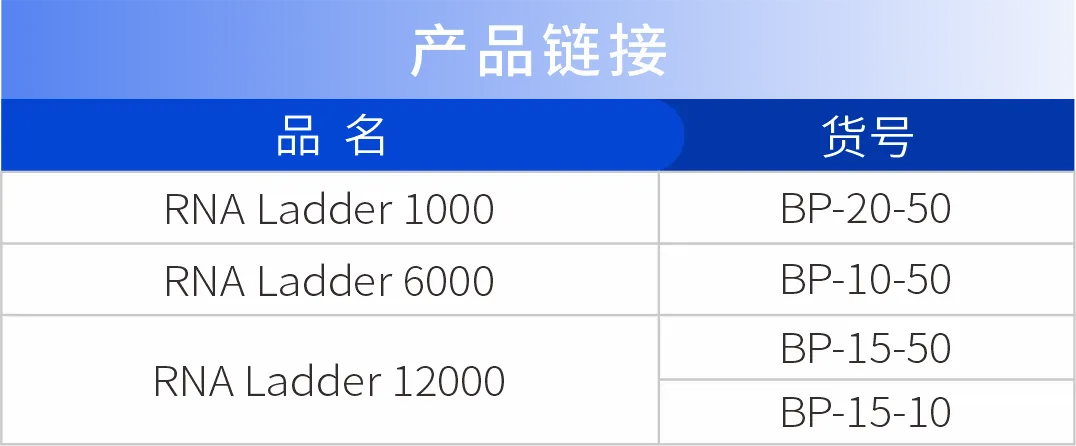 宝锐生物于2023年和2024年分别推出200-6000bp大小的RNA Ladder 6000 (产品货号:BP-10-50) 和1000-12000bp大小的RNA Ladder 12000 (产品货号:BP-15-50) ,这两款高范围RNA Ladder适用于基因治疗、生物制药等领域多种RNA的分析实验。