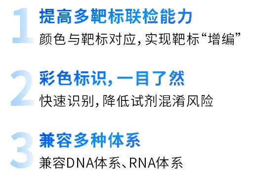 彩色冻干技术,突破了常规冻干试剂单一色彩的局限,让复杂的操作变得简单可靠,为冻干型多靶标联检“增编”检项排除了混淆风险,让分子检测试剂从生产端到检测端,实现全程可视。