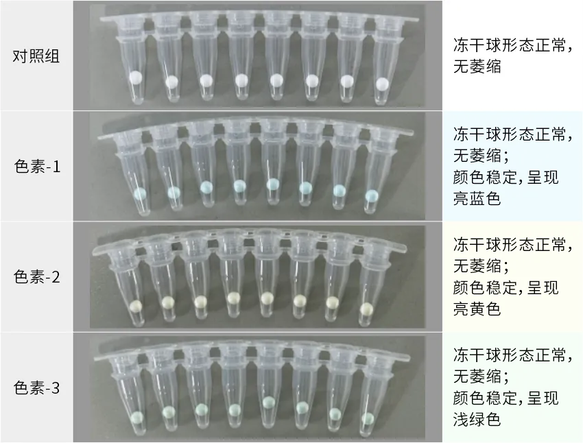 注:对照组为不含色素的冻干样品;样品出箱后均使用铝箔袋真空包装。