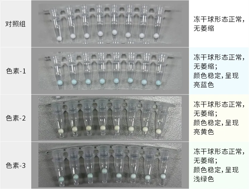 彩色冻干的核心,在于将分子诊断试剂冻干固态化的同时,创新性地融入了安全、稳定,无干扰的色素,赋予不同功能/项目的冻干试剂鲜明的专属颜色,实现视觉标识功能,解决传统冻干试剂在分装、运输和使用中的识别难题。