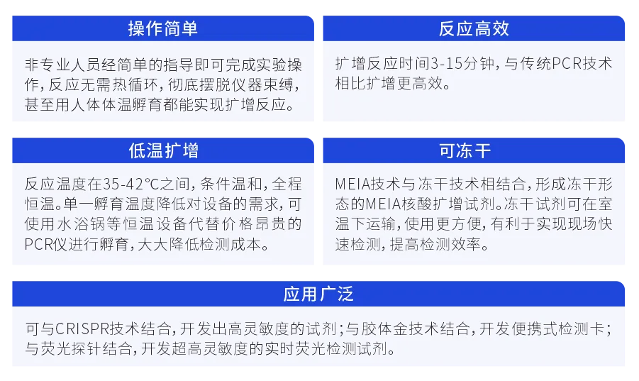 Based on its advanced molecular biology technology and development platform, Baorui Biotechnology has, through repeated technical verification and innovation, developed a new generation of nucleic acid Isothermal Amplification technology with leading performance - Multi-Enzyme isothermal amplification (MEIA). This technology achieves amplification within 3 to 15 minutes at a relatively mild reaction temperature of 35 to 42 degrees Celsius through the synergistic action of multiple enzymes. The results can be interpreted in combination with various methods such as agarose gel electrophoresis, fluorescent probes and colloidal gold test strips.