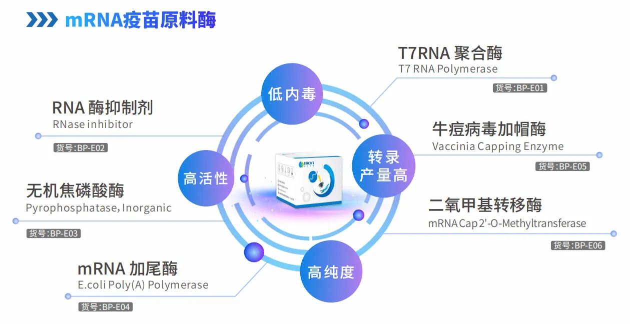 Baorui Biotechnology has now developed stable and high-yield RNA transcription-related raw material enzymes, including T7 RNA polymerase, inorganic pyrophosphatase, RNase inhibitors and other raw material enzymes. In response to the downstream application scenarios of customers, we have simultaneously developed enzyme raw materials such as varicella-virus capping enzymes, dioxomethyltransferases, and mRNA tailing enzymes. For the above-mentioned enzyme raw materials, a GMP-level quality attribute inspection plan has been established, which can stably provide customers with compliant and high-yield enzyme raw materials for mRNA vaccine production.