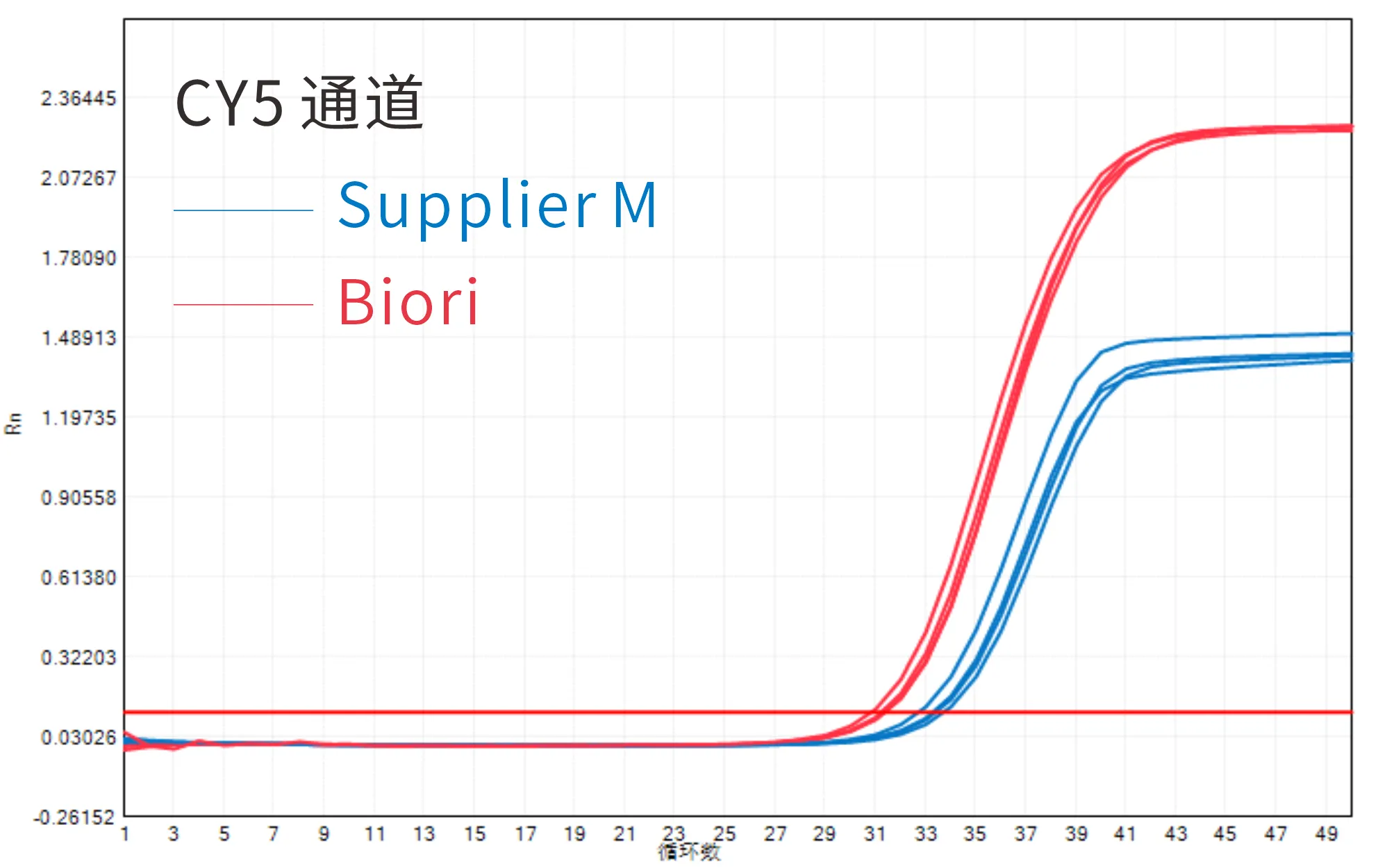 Note: In the above amplification graph, for the product of Supplier M, as the fecal background increases, the Ct value increases and the Rn value decreases.